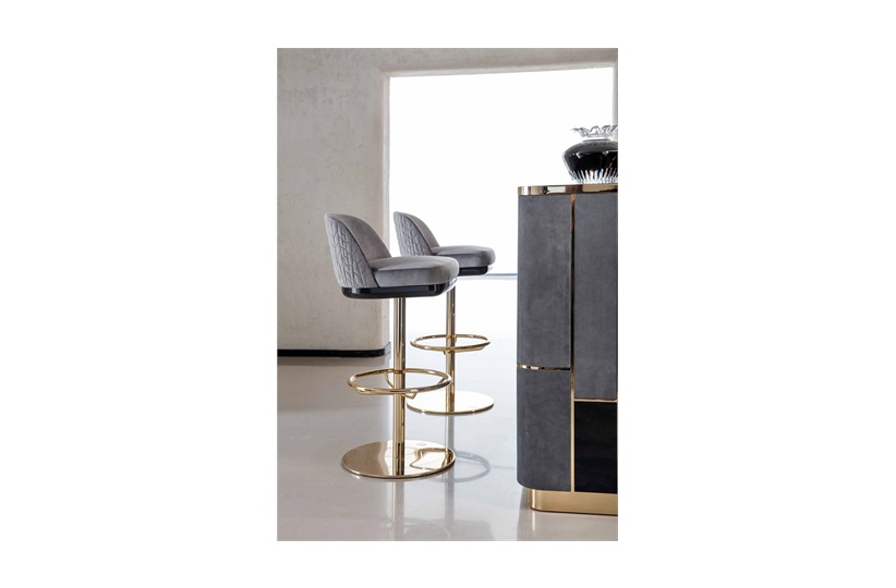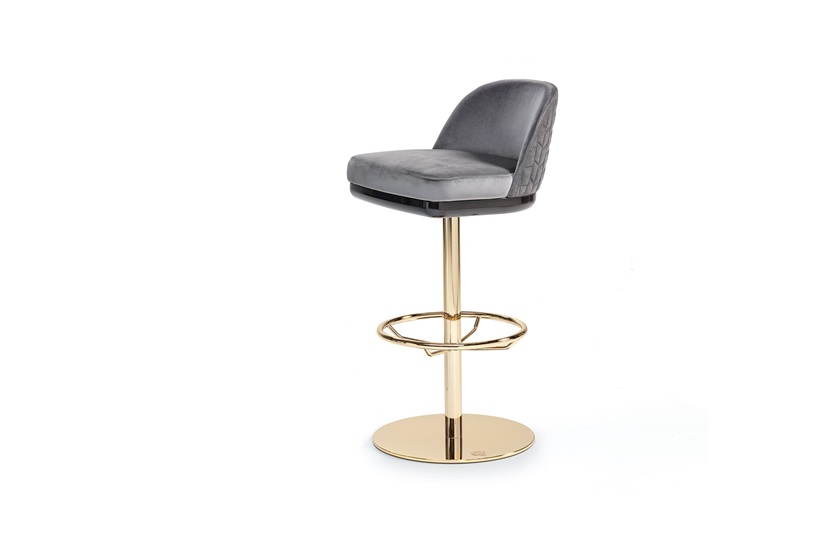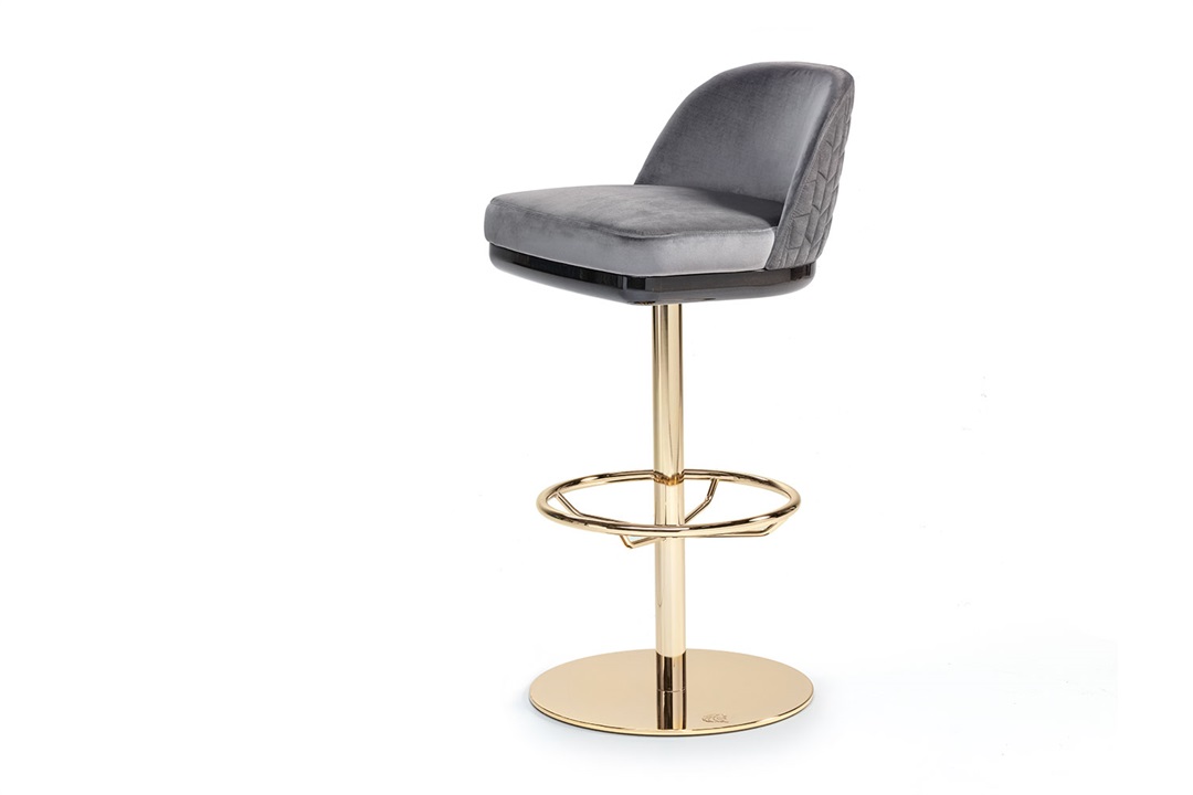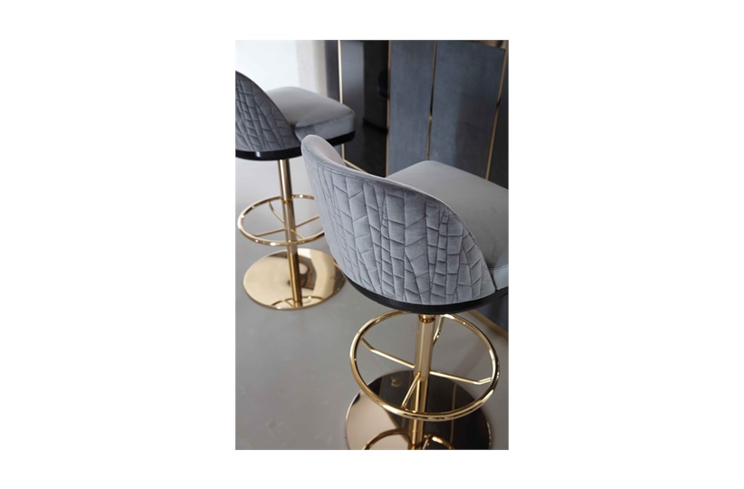 Charisma Bar Stool Seat yourself and your guests comfortably and in style with the Charisma Bar Stool. This Giorgio Collection piece offers both form and function with the combination of beautiful materials as well as back and feet rests to guarantee a comfortable seat. The seat is perfectly cushioned and upholstered in a light grey, with beautiful patterning created by seams throughout the back. The seat is supported by thin, pole-like pedestal, which perfectly connects to the circular foot rest and base; all of which are crafted in a light gold, chrome stainless steel. MR-CHRM-BAR-001-001
