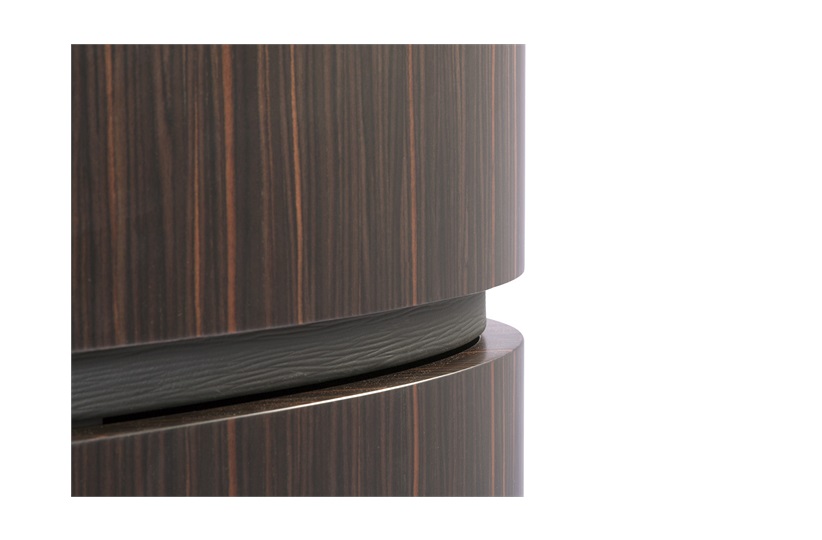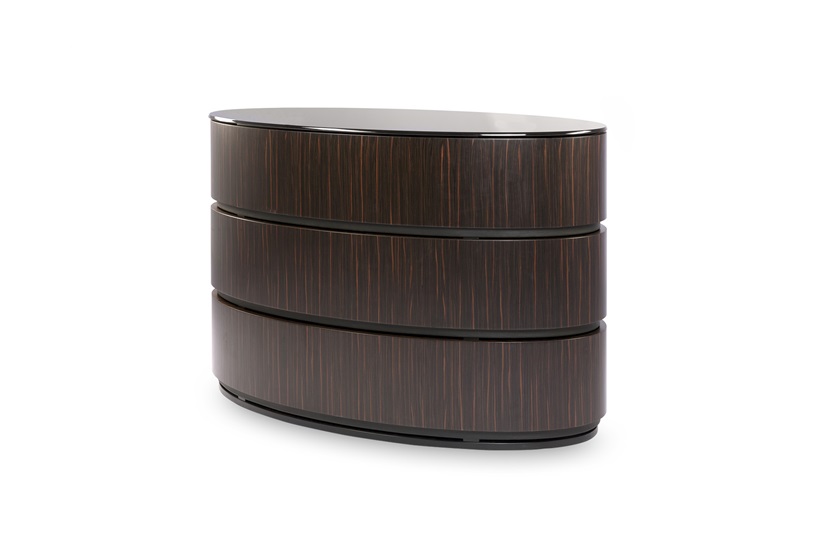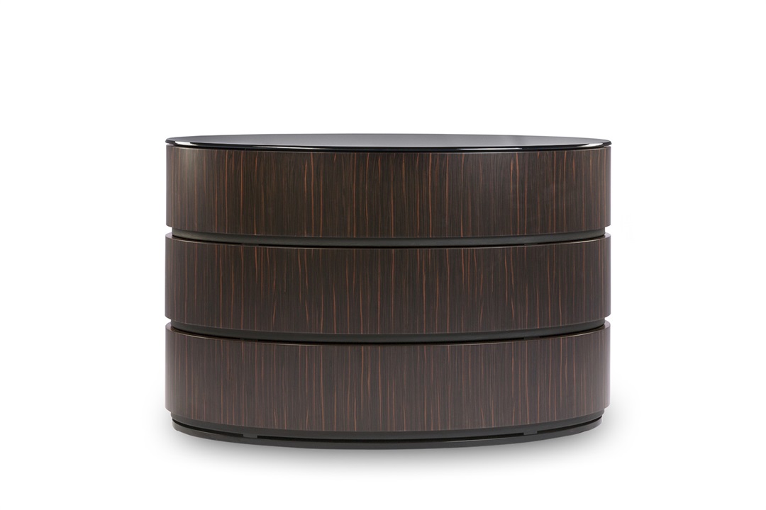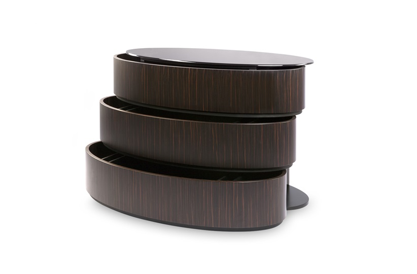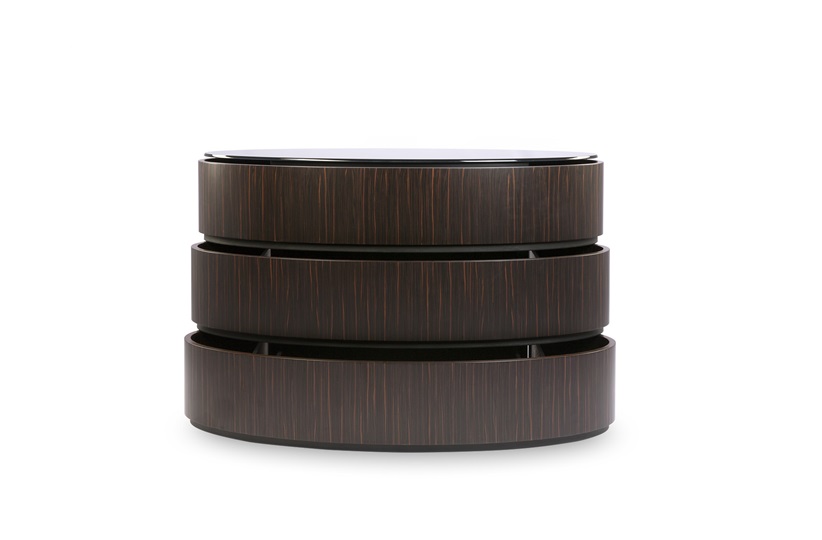 An impressive and unique design, these drawers are both a functional storage solution and a smart addition to the bedroom. Fashioned from ebony, black dune leather and topped with smoked glass, the drawers rotate around a central column, creating a striking design visual. Available in three sizes. MR-REF-CHE-001