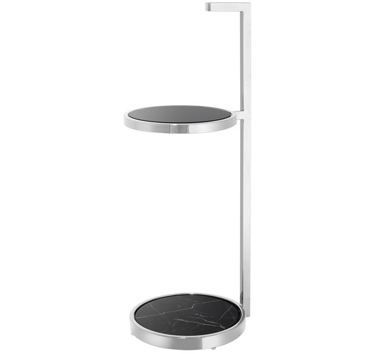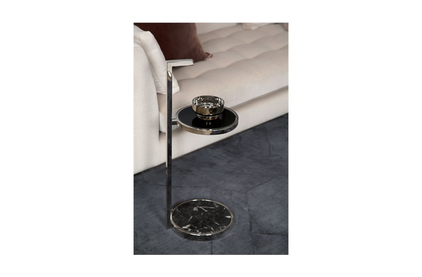 The Exton Side table is a charming, minimalist piece, suitable for moving around as needed with a nifty –yet stylish – handle on top. The frame is made of polished stainless steel and features a black marble lower shelf and black glass upper shelf. Pair it with soft velvet upholstery for the ultimate luxury or tightly-fitted leather upholstery for the 'cool' factor. MR-EXTO-STB-001-001