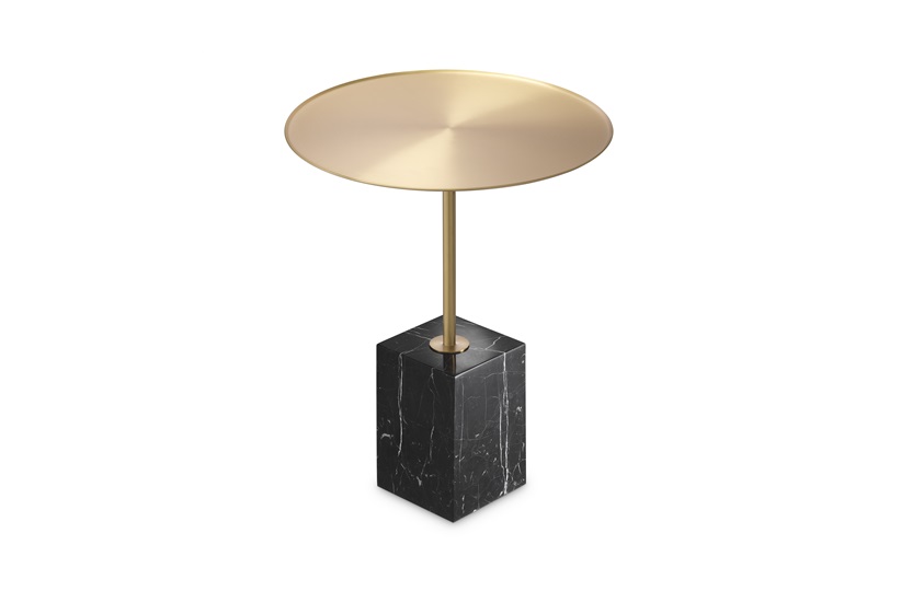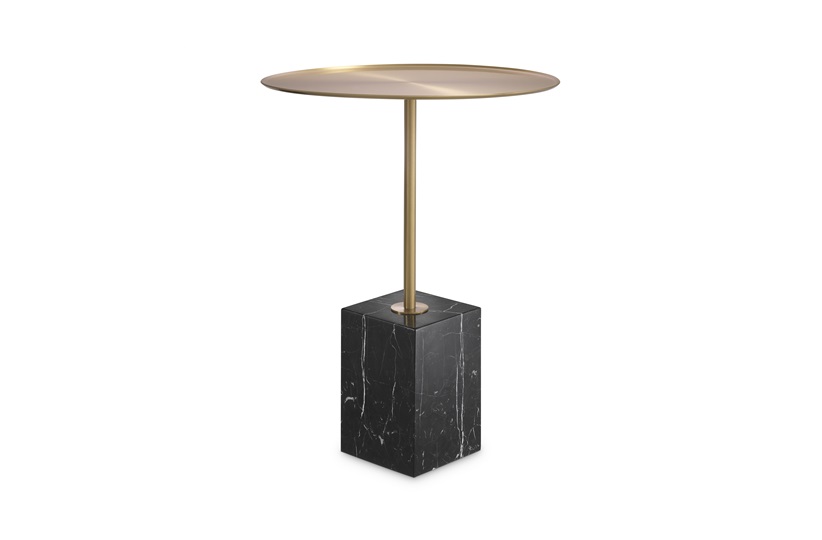 Side Table Cole is all about simplicity and natural appeal. The round brushed brass table top is embellished with raised edges. It sits on a sleek stem which firmly rests on a block of black marble with white veins, giving it a chic and elegant look. MR-COLE-STB-001-001