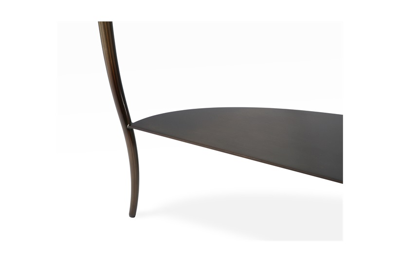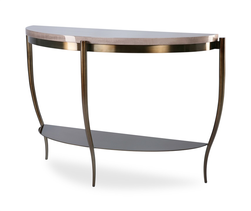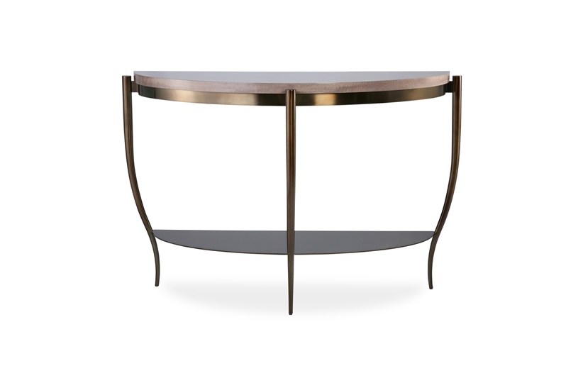 A modern take on the classic demilune console, this sleek piece instantly adds beauty to an interior. The antique brass structure and elegant curves perfectly complement its glossy ebony top, offering the perfect addition to a hallway.