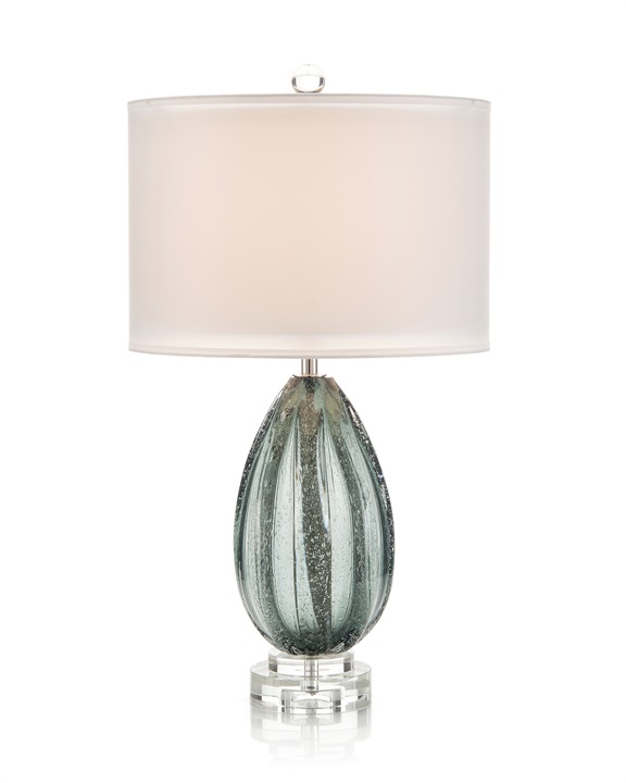 Rainstorm Blue Glass. A handblown blue glass table lamp has a crystal base. White Organza outside and White Man-Made Silk inside, Round. MR-VAKA-LMP-001-001