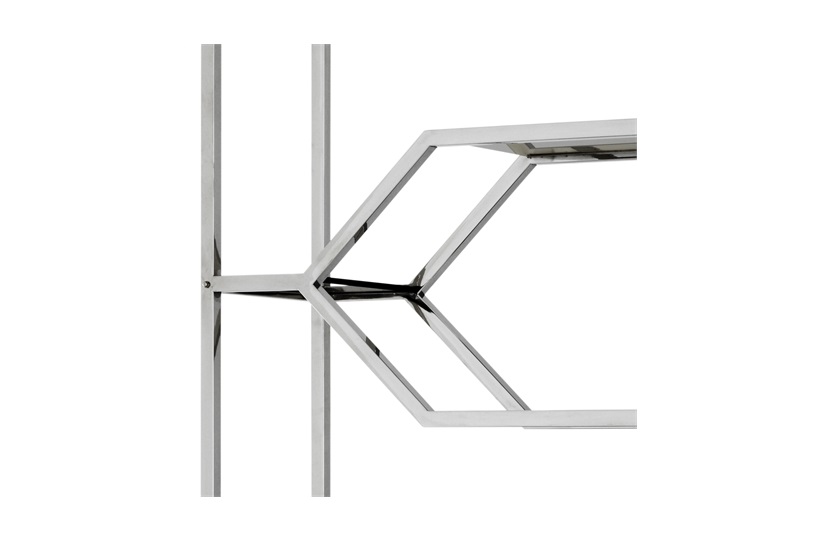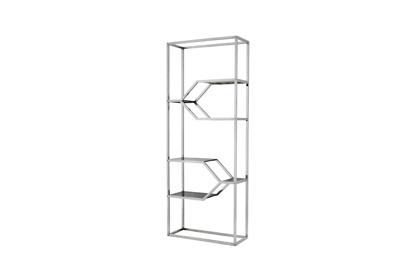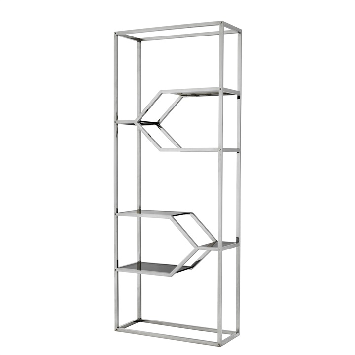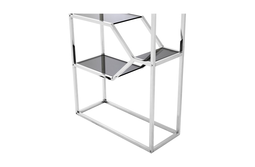 Welcome the urban modern appeal of the Myconian Cabinet into your home. With its beautiful geometric design, this gorgeous etagere adds a focal point to your hallway, lounge or bedroom. The polished stainless steel frame contains two small and four larger smoke glass shelves. MR-MYCO-BOO-001-001