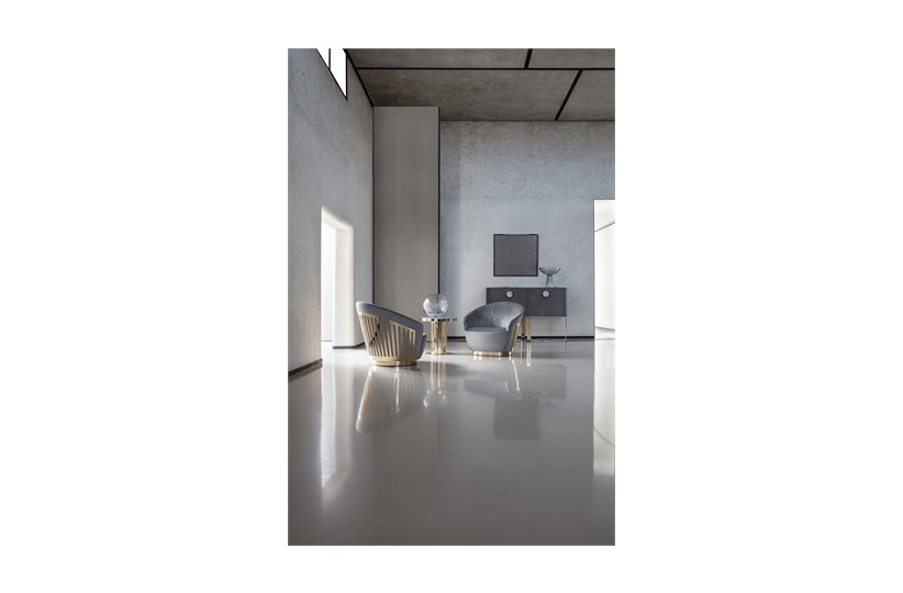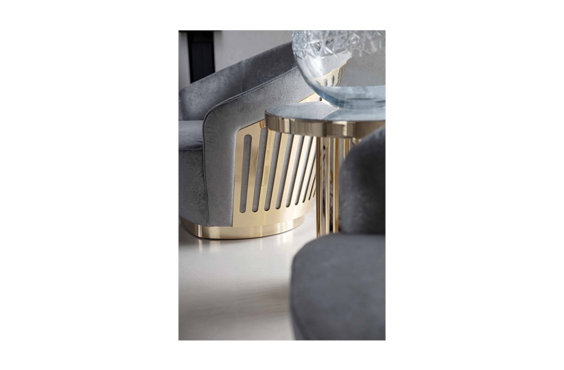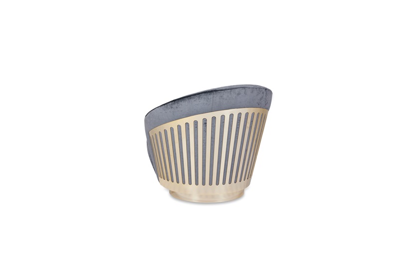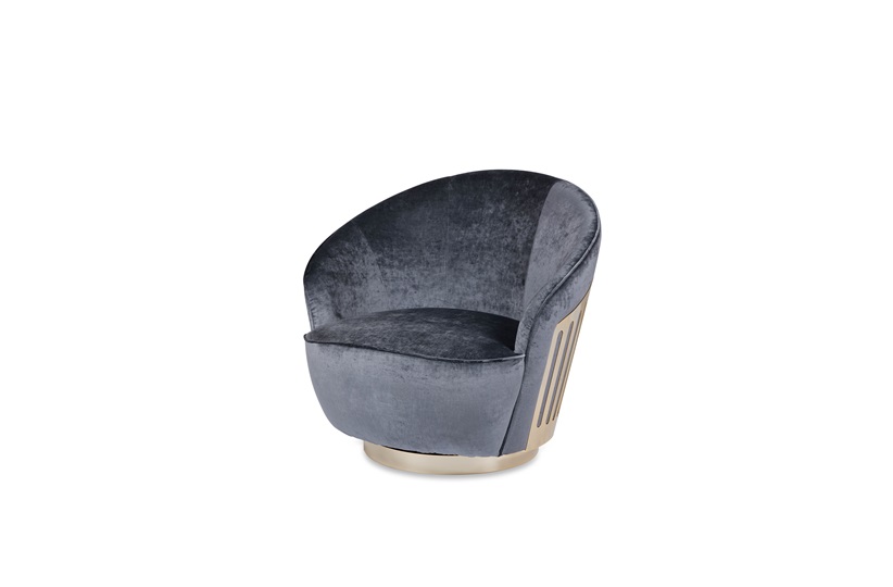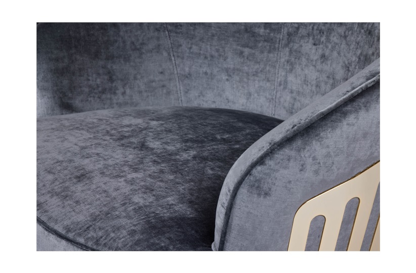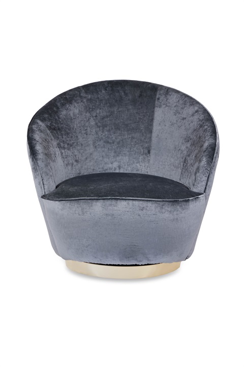 The Charisma Swivel Armchair is perfect execution of soft materials and bold details. This Giorgio Collection piece has rounded top which gently curves into comfortable arm rests. This perfectly padded, light grey seat offers both comfort and luxury with gold detailing found throughout the design. The back features a gold addition which follows the line created by the top of the chair. Within this reflective gold detailing are thin, rounded cut-outs allowing the material to still be seen. MR-CHRM-ARM-001-001