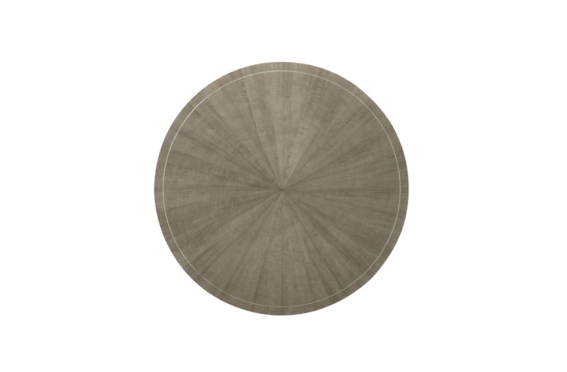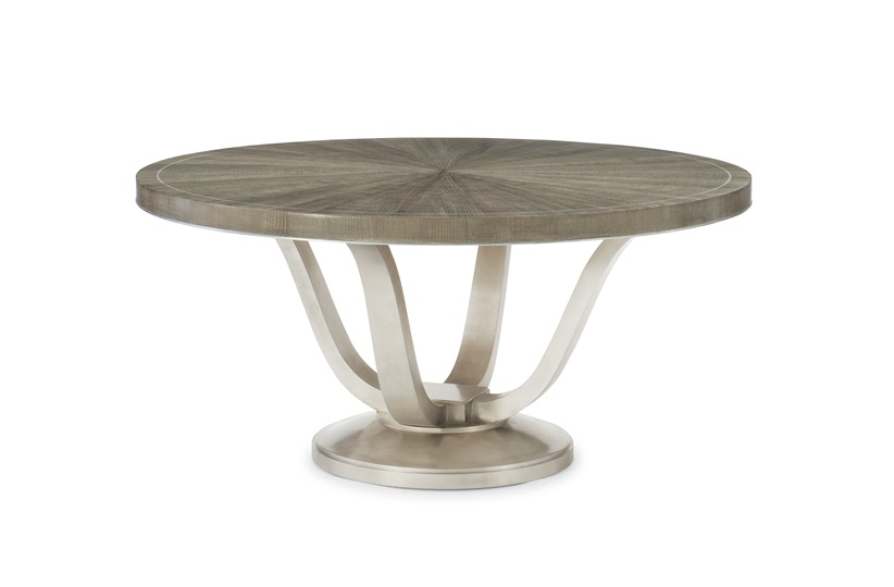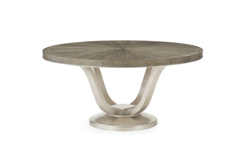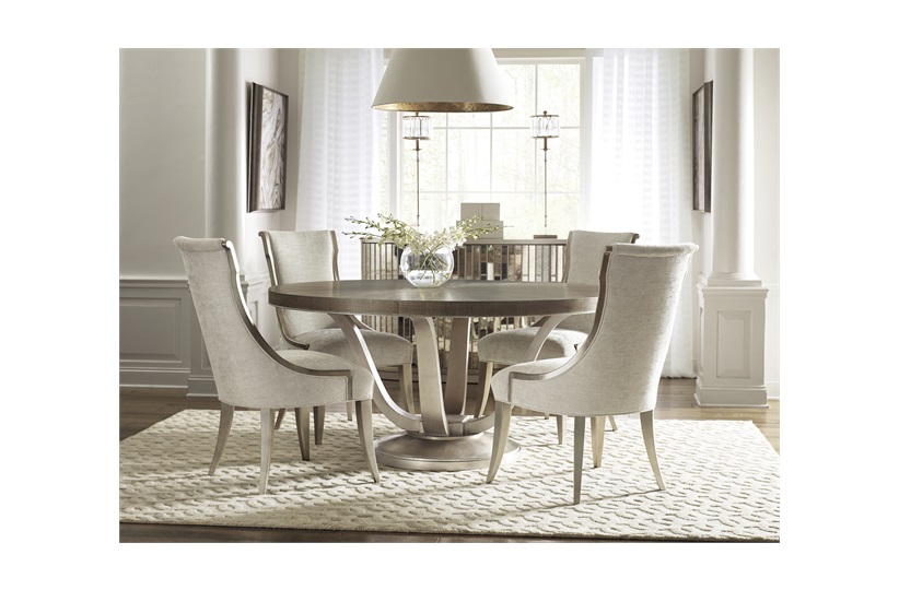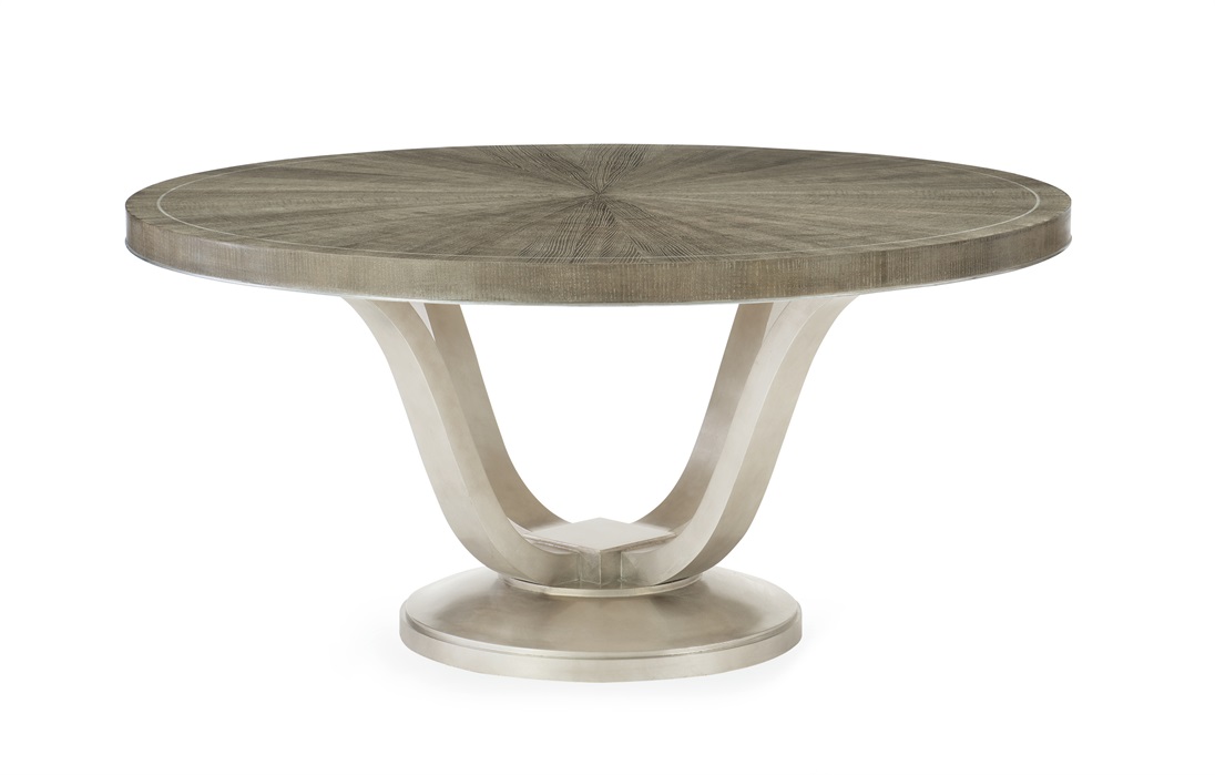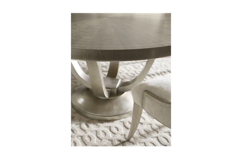 Round dining tables are made for good conversations. This piece has lightly figured Quartered Ash veneer set in a starburst pattern, finished in Elegant Linen, and detailed with a Soft Silver Leaf silkscreen stencil around the top. Four curving, tulip-shaped legs meet at a round base adding immense interest to this piece. This table comfortably seats 6 people. MR-AVON-DNT-001-001