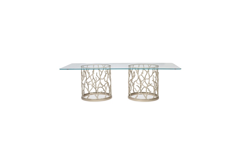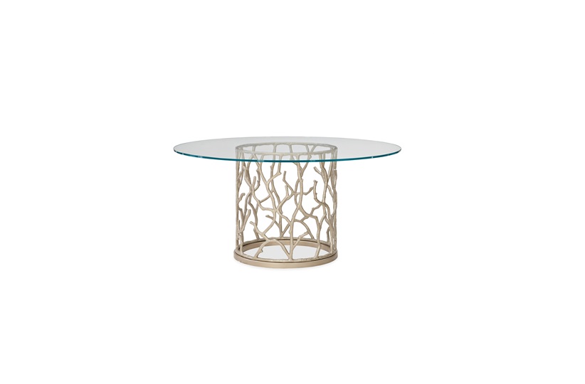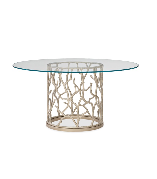 Only the ocean could inspire a design as boldly memorable as this round dining table. Crafted of cast metal, its base channels the beauty of a coral reef and the majesty of the world that lies beneath the surface of the water. Magnificent from every angle, the distinctive design of this bold piece is highlighted with a Neutral Metallic finish that combines the beauty of silver and gold tones and blends seamlessly with both as well. A substantial 60-inch tempered-glass top makes it easy to see the beauty of this one-of-a-kind table and creates a dramatic dining space. MR-ALIH-DNT-001-001