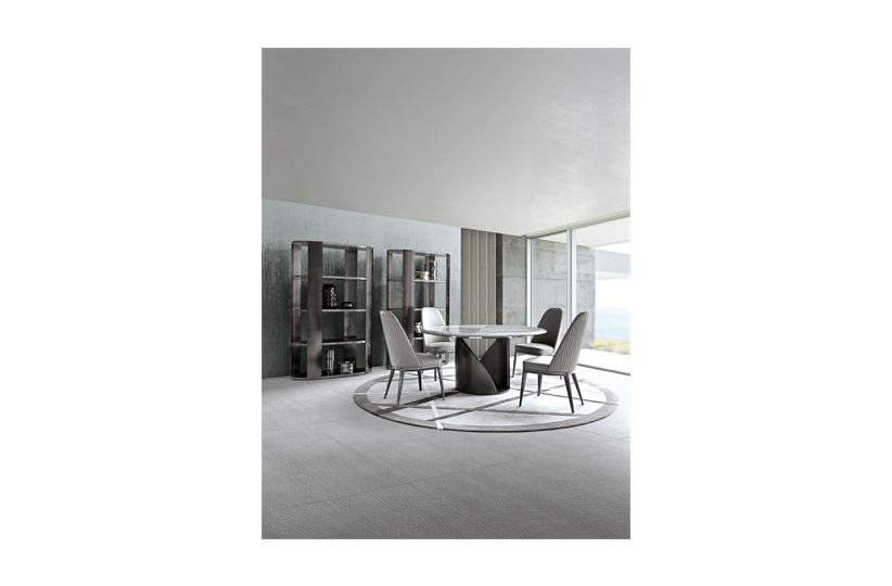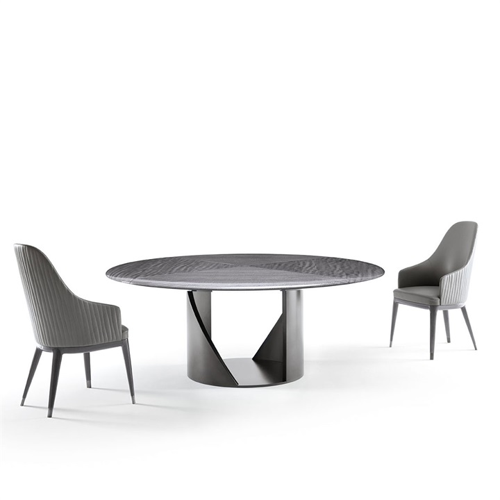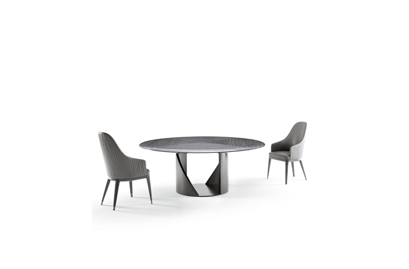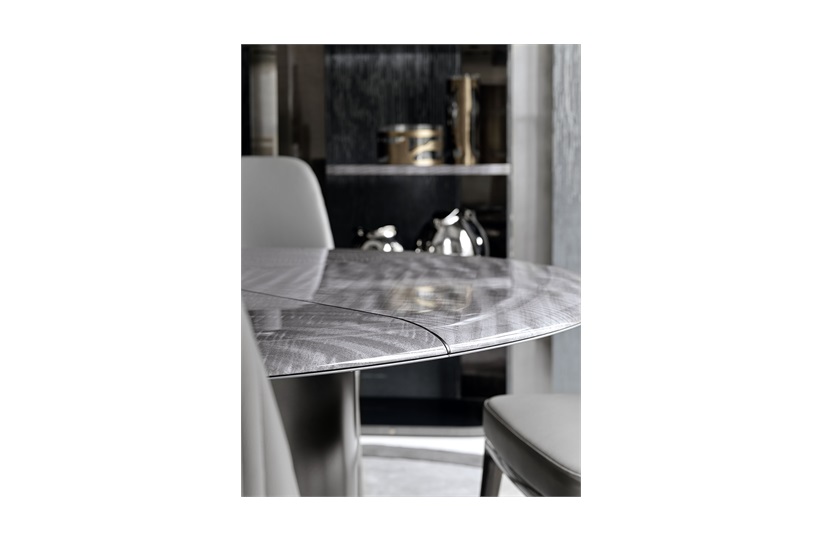 Mirage Dining Table The Mirage Dining Table is designed to seemingly defy gravity. A rounded top displays a beautiful veneer which mimics the appearance of waves in a gorgeous grey. The round top is separated into four triangular shapes perfectly combining modern lines with organic patterns. This opulent top is supported by an incredibly designed base where two sloping lines seem to reach up and suspend the top effortlessly in the air. The base is made with satin black nickel to ensure that this table is beautiful from every angle. The Mirage Dining Table is a part of the Giorgio Collection, ensuring its quality to be second to none. This piece can comfortably seat six individuals. MR-MIRA-DNT-001-001