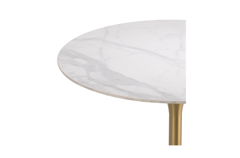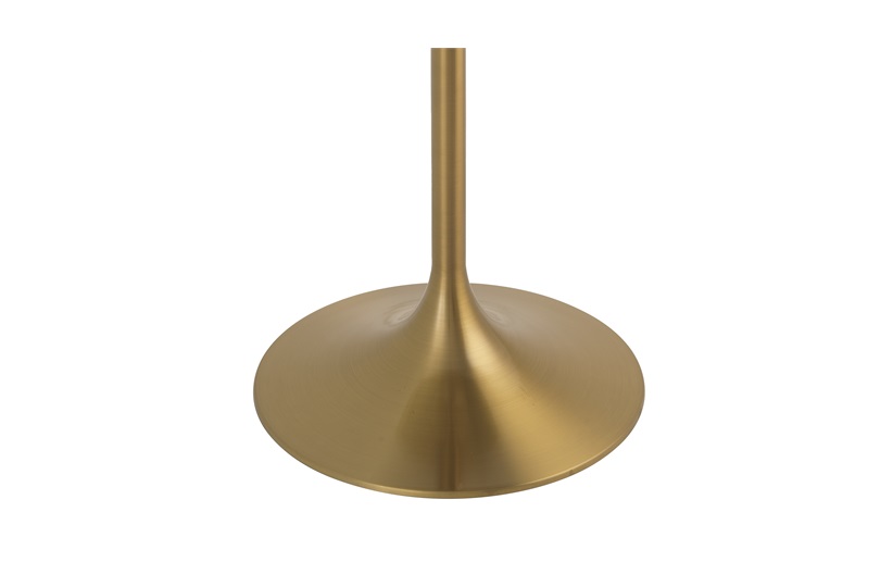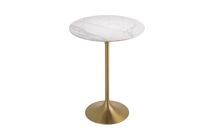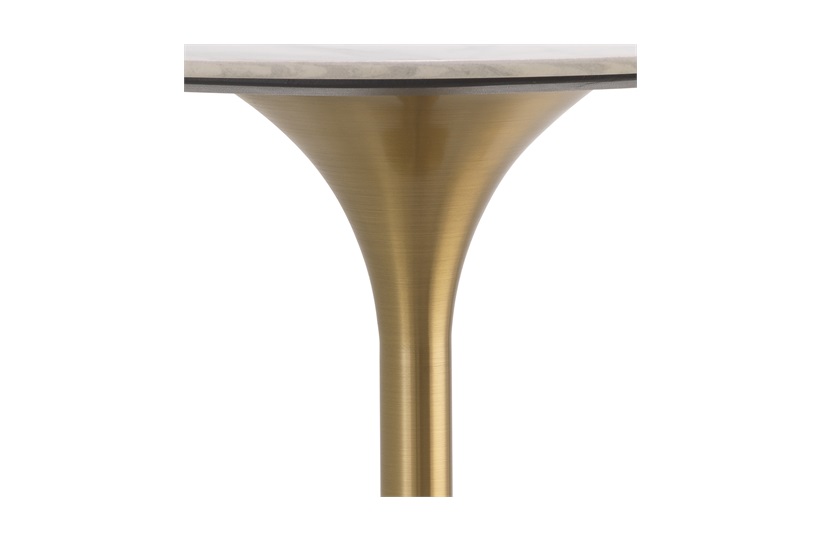 Bar Table Tazio is a très chic translation of the classic standing café table. Its circular ceramic top with marble look is supported by a brushed brass column fanning out on both sides like a trumpet bell. MR-TAZI-DNT-001-001