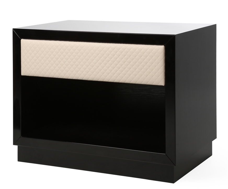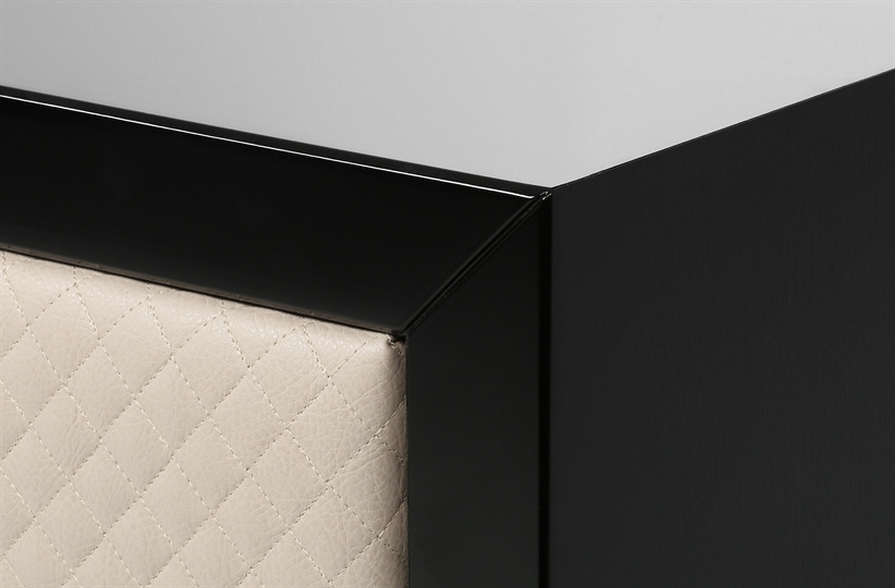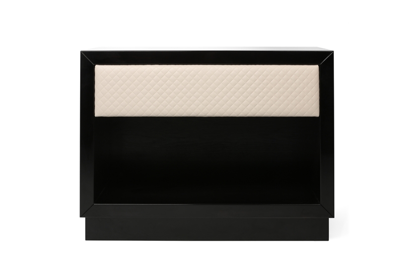 The Soho side table is a practical and elegant piece designed to complement a number of the beds in our range. The lacquered surface and faux leather padded drawer enhance the richness of the design while the cream coloured draw contrasts beautifully with the dark lacquered wood. The size, fabric and wood finish can be tailored to your requirements. SR-SOHO-BST-03-F004