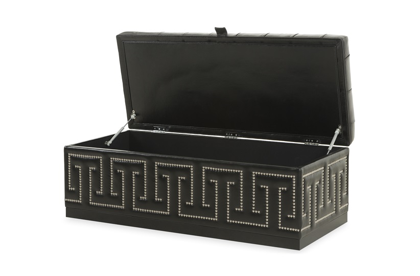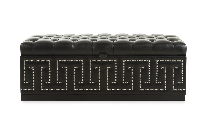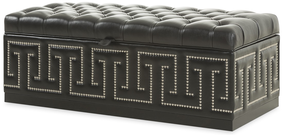 Bespoke Ottoman with deep buttoning and Greek Key design studding. SR-BB-OTT-M-F003