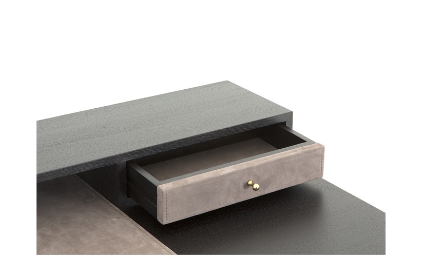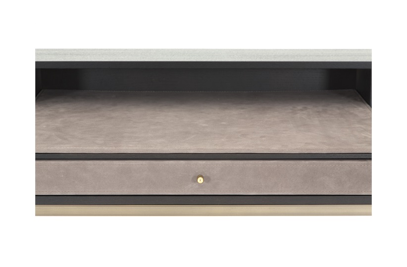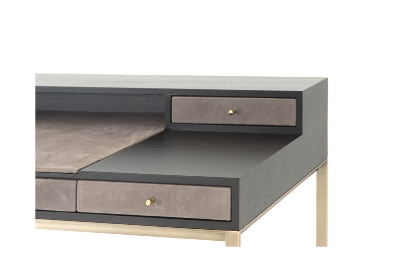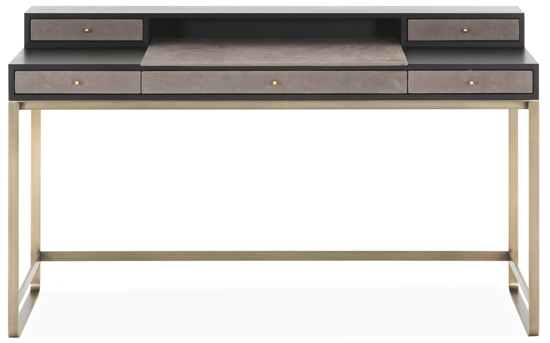 The Berkley desk is a handsome addition to any study, this desk is upholstered with fine leather detail, standing on a elegant bronze frame. A rich oak mocha finish completes this piece. MR-BERK-DEK-001-001